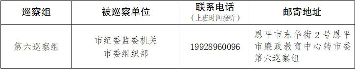 根据市委巡察工作统一部署,从2026年3月上旬至2026年5月中旬,市委派出第六巡察组对市纪委监委机关、市委组织部开展常规巡察。根据有关规定,巡察组在巡察期间设立专门联系电话和邮寄信箱,主要受理反映被巡察单位党组织领导班子及其成员、下一级党组织主要负责人和重要岗位领导干部问题的来电、来信、来访。重点是关于违反政治纪律、组织纪律、廉洁纪律、群众纪律、工作纪律、生活纪律,以及违反中央八项规定及其实施细则精神等方面的举报和反映。其他不属于巡察受理范围的信访问题,将按规定由有关部门认真处理。欢迎广大党员干部群众反映情况。